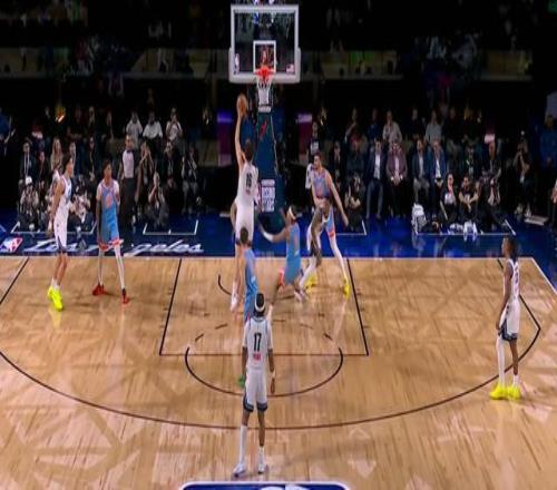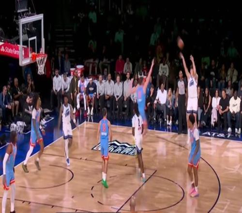 克林根蹲守在內線,楊瀚森在側翼三分線外站位,隊友突破分球,克林根象征性撲了出來,楊瀚森柔和手感三分命中。看得出來,楊瀚森肯定是有三分底子的,在平時訓練也不少進,否則開拓者也不會一直讓他投。