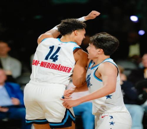 楊瀚森第四個球,則是展現小里弗斯(楊瀚森所在隊伍的主教練)的戰術水準,尼德豪澤低位要球,后衛傳給尼德豪澤之后迅速去底線給楊瀚森做一個掩護死死擋住克林根,楊瀚森擺脫之后接到尼德豪澤的傳球,利用身高差打進勾手。