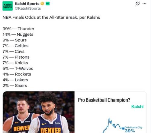 NBA最新奪冠概率出爐!短板明顯的火箭隊與湖人隊皆為4%,騎士拿下哈登后7%屈居第4,第一雷霆39%概率斷檔領跑。