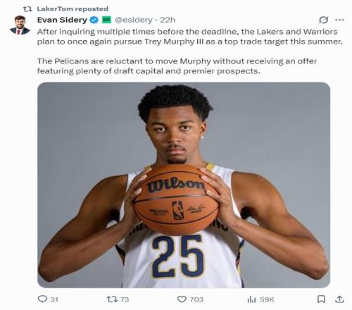 北京時間2月13日,《福布斯體育》記者埃文-斯迪瑞透露,鵜鶘隊在交易截止日不會交易錫安、墨菲、瓊斯三位鋒線,但在今夏休賽期勇士、湖人兩支球隊有意交易得到特雷-墨菲,鵜鶘隊不愿意在沒有收到大量首輪簽資產(chǎn)的情況下低價送走墨菲。