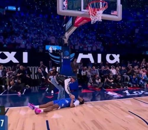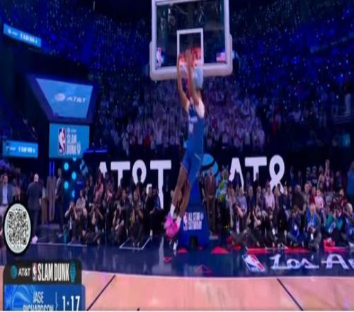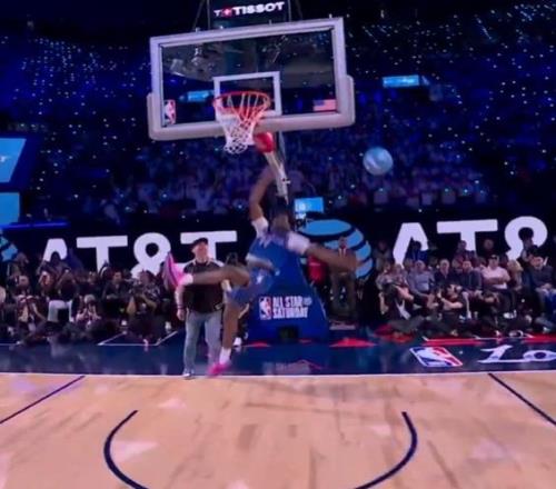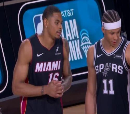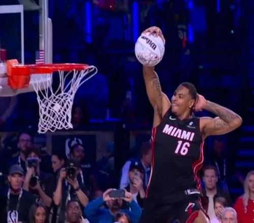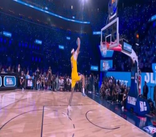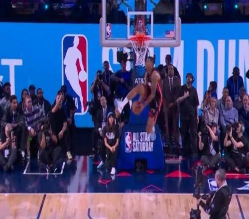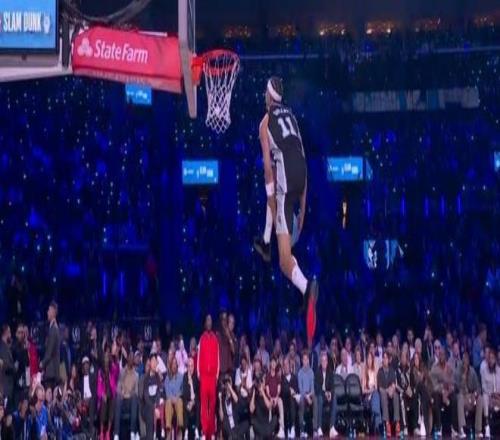 第三位登場的是熱火球員凱沙德-約翰遜,他登場先進行了一段舞蹈秀,他從右側(cè)啟動嘗試飛躍一人未能完成,隨后凱沙德-約翰遜左手摸后腦勺飛躍說唱歌手,完成暴扣完成拉桿暴扣獲得47.4分。
