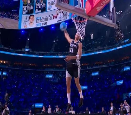 卡特-布萊恩特決賽第一扣從右側(cè)弧頂啟動,拋球到籃下加速起飛高高躍起,接反彈球完成胯下?lián)Q手側(cè)身暴扣,由于難度更高獲得滿分50分,也是今年扣籃大賽首個滿分扣籃。