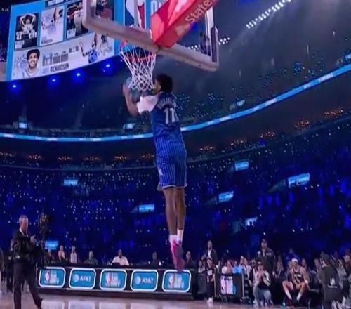 第二位登場(chǎng)的是魔術(shù)新秀杰斯-理查德森,他奉獻(xiàn)一記折疊背扣,得到45.4分。