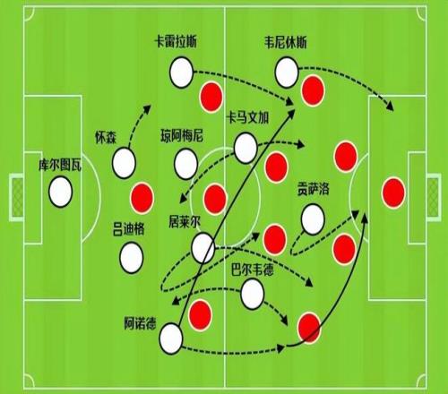 這一次的進(jìn)攻,最初來(lái)自于瓊阿梅尼的遠(yuǎn)射,在被封堵之后,皮球轉(zhuǎn)移到側(cè)翼,隨后傳中球打禁區(qū)后點(diǎn)。