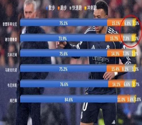 普雷斯蒂安尼雖然沖刺跑比例2.3%不算特別高,不過(guò)算上快速跑后,這兩項(xiàng)數(shù)據(jù)綜合也要接近10%,達(dá)到了高水準(zhǔn)。相比之下,姆巴佩沖刺跑僅有0.8%,加上快速跑之后也僅有4.4%。
