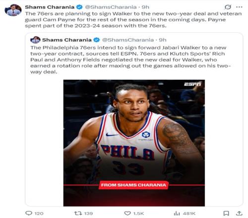 除此之外,費城計劃在未來日年后與前NBA后衛卡梅隆-佩恩續約至賽季結束,佩恩曾在23-24賽季曾為費城效力過一段時間。