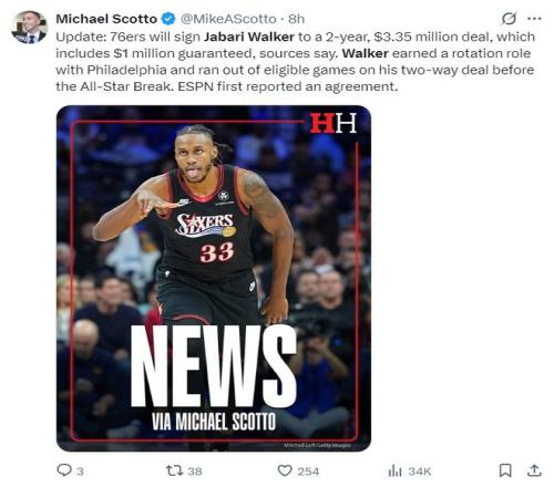 根據邁克爾-斯科特的報道,費城76人與賈巴里-沃克簽下的是一份兩年335萬的合同,而這兩年合同僅保障100萬美元。費城在全明星周末前就已經為沃克預留了輪換位置,當他雙向合同日期截止后立馬為其辦理了轉正。
