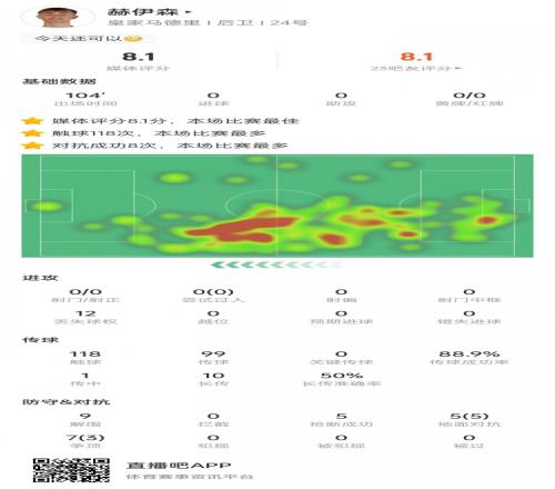 赫伊森數據:9次解圍+5次搶斷,12次對抗8次成功,8.1分全場最高