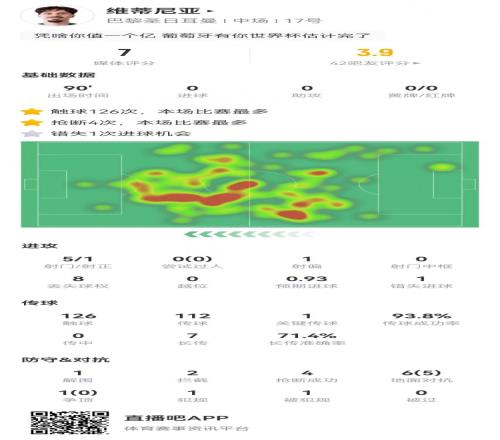 體育播報2月18日宣 巴黎在本輪歐冠3-2逆轉摩納哥,維蒂尼亞本場數據: