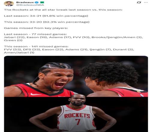休媒Bradeaux曬出火箭隊(duì)本賽季與上賽季全明星周末前的戰(zhàn)績,本賽季火箭隊(duì)在多位核心合計(jì)傷缺141場(比上賽季多64場)的情況下勝率還略高一些(62.3%-61.8%)。