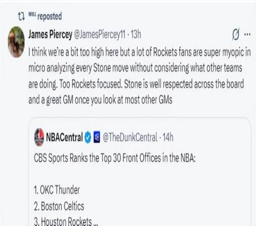 火箭記者James Piercey寫道:很多人覺得斯通的排名過高了,很多火箭球迷對(duì)斯通的每一個(gè)舉動(dòng)都進(jìn)行微觀的分析,他們一直都在關(guān)注火箭隊(duì),斯通在各個(gè)方面都頗受尊重,而且你們對(duì)比一下其他球隊(duì)的總經(jīng)理,你就會(huì)發(fā)現(xiàn)斯通是一位非常出色的GM。