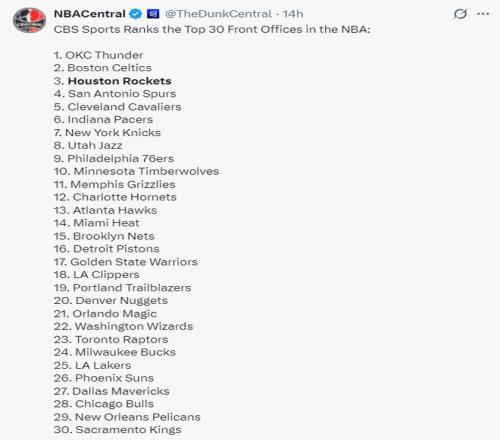北京時(shí)間2月18日,CBS公布了聯(lián)盟30支球隊(duì)的管理層排名,雷霆第一、綠凱第二、火箭第三、馬刺第四、騎士第五。