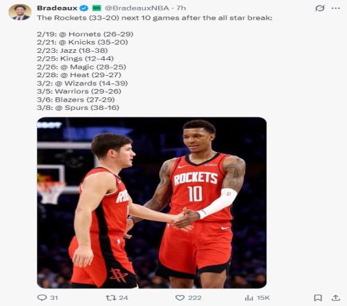 有7場比賽是面對(duì)附加賽 、季后賽圈內(nèi)的球隊(duì),其中還有兩場比賽是背靠背,火箭隊(duì)的魔鬼賽程即將到來。
