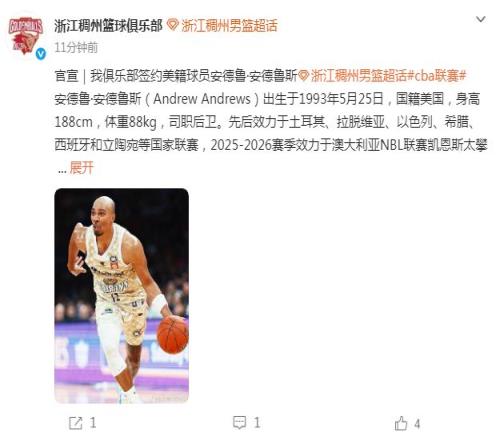 待向CBA公司完備其注冊手續,安德魯-安德魯斯將正式成為俱樂部球員,代表浙江稠州金租男籃征戰2025-2026賽季CBA聯賽!安德魯斯將于2月24日到隊,賽季身披7號球衣出戰。
