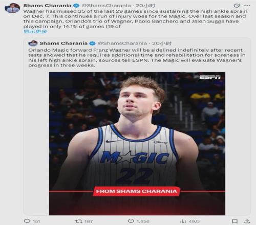 據NBA名記Shams報道,魔術球星弗朗茨-瓦格納因腳踝高位扭傷,無限期缺陣,三周后接受重新評估。由于左腳踝高位扭傷,過去29場比賽,小瓦格納缺席了25場。從上賽季至今,小瓦格納、班凱羅和薩格斯,僅僅合體打了19場。
