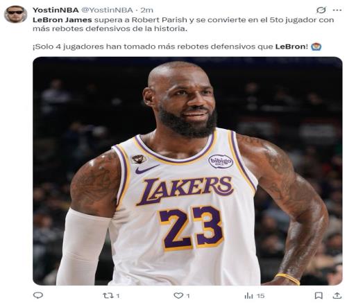 數據媒體寫道:詹姆斯的防守籃板超越帕里什升至歷史第五,歷史上只有4人的防守籃板比他多。