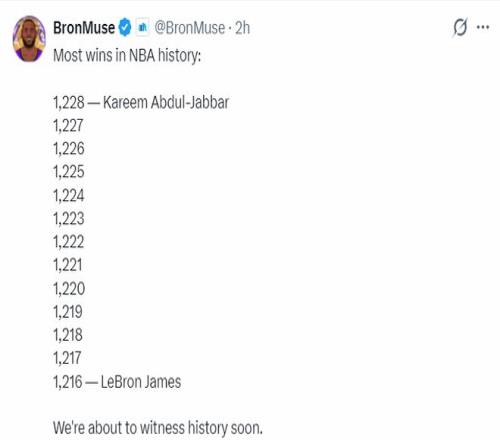 除此之外詹姆斯還坐等三項里程碑,此役拿到13分后他還差12分就完成43000分里程碑;詹姆斯勝場數1216場,距離賈巴爾1228場只差12場,詹姆斯又要歷史第一;詹姆斯距離帕里什1611場比賽場數只差12場,也要升歷史第一了。