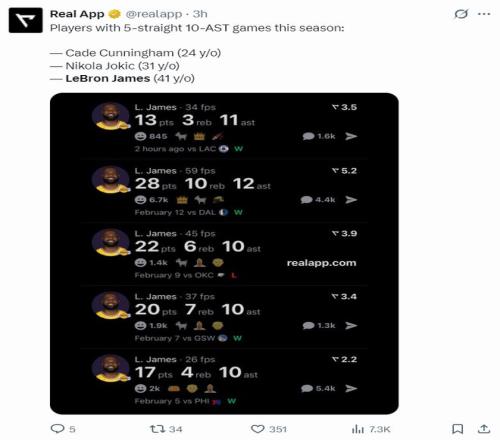 3.詹姆斯本賽季首次連續五場得分+助攻都上雙;