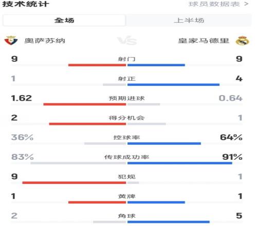 體育播報2月22日宣 西甲第25輪,奧薩蘇納上半場暫1-0皇馬。