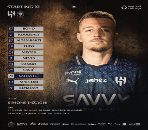 利雅得新月首發(fā):37-布努、3-庫利巴利、87-坦巴蒂、19-特奧、24-莫特卜、8-魯本·內(nèi)維斯、28-卡努、22-米林科維奇、29-薩利姆·多薩里、10-馬爾科姆、90-本澤馬