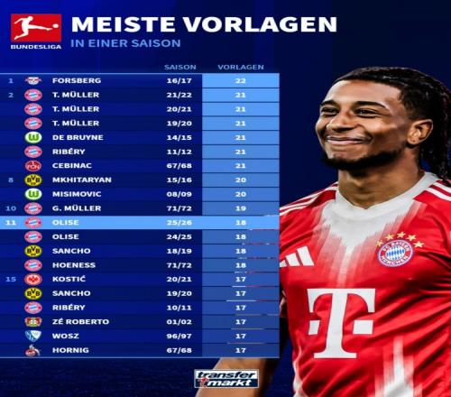 體育播報(bào)2月21日宣 德轉(zhuǎn)盤點(diǎn)了德甲歷史單賽季助攻榜,其中本賽季奧利塞22輪過后取得18次助攻,有望打破歷史紀(jì)錄,具體榜單如下: