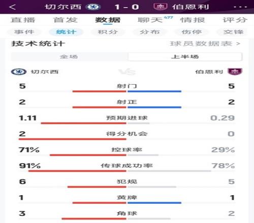體育播報(bào)2月21日宣 本輪英超切爾西對(duì)陣伯恩利上半場(chǎng)戰(zhàn)罷,切爾西憑借若昂·佩德羅進(jìn)球暫時(shí)1-0-領(lǐng)先,以下為雙方半場(chǎng)數(shù)據(jù)對(duì)比:
