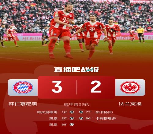 拜仁3-2擊敗法蘭克福,凱恩梅開二度,拜仁比賽尾聲連丟兩球最終險勝。