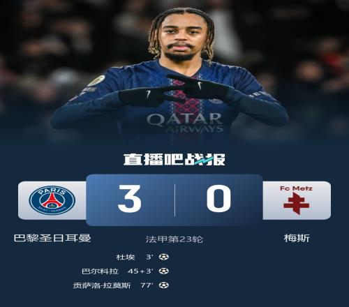 巴黎主場3-0大勝梅斯,2分領跑法甲積分榜;梅斯繼續墊底。