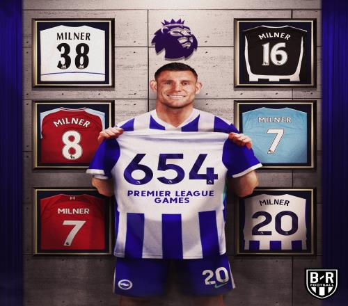 本輪英超,40歲的米爾納迎來個人英超第654次出場,這一數據打破了他自己與加雷斯·巴里保持的英超歷史出場紀錄。