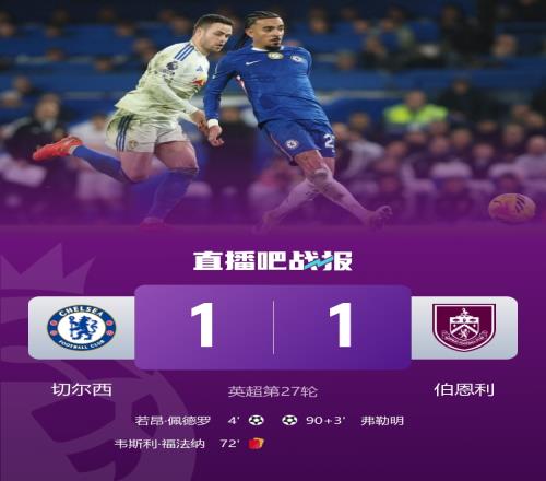 切爾西1-1伯恩利,藍軍聯賽遭兩連平,凈勝球優勢暫排第四。