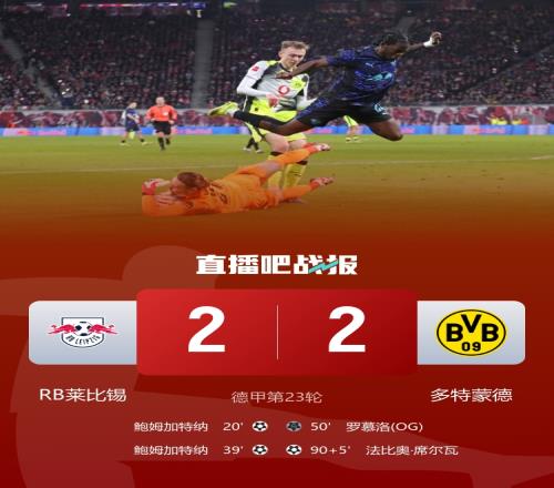 多特2-2萊比錫,各項賽事4連勝終結,落后榜首的拜仁8分,暫時排名第二。