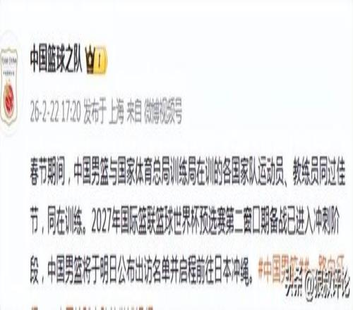 春節期間,中國男籃與國家體育總局訓練局在訓的各國家隊運動員、教練員同過佳節,同在訓練。2027年國際籃聯籃球世界杯預選賽第二窗口期備戰已進入沖刺階段,中國男籃將于明日公布出訪名單并啟程前往日本沖繩。