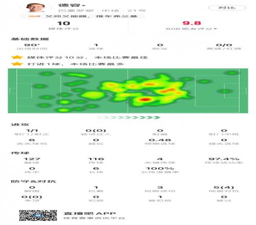 本場比賽荷蘭中場弗蘭基?德容為巴薩首發踢滿全場,全場比賽他不僅完成破門,還成為球隊的節拍器,傳球多達116腳的同時,傳球成功率高達97%。最終他獲得了10分的滿分評分,同時當選全場最高評分。