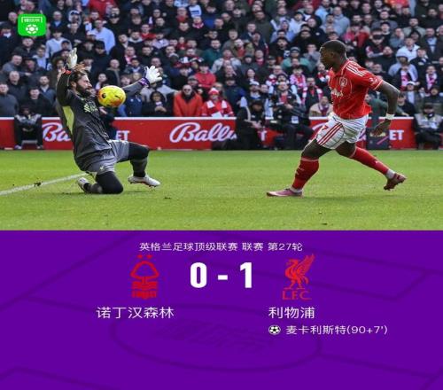 北京時間2月22日英格蘭足球頂級聯賽 聯賽 第27輪,諾丁漢森林主場對陣利物浦。利物浦麥卡利斯特破門。最終比分諾丁漢森林 0-1 利物浦。