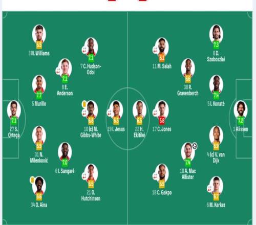 諾丁漢森林首發:27-奧爾特加、5-穆里略、31-米倫科維奇、34-埃納、3-內科·威廉姆斯、6-桑加雷、8-埃利奧特·安德森(75’20-盧卡)、21-哈欽森(61’29-巴卡瓦)、10-吉布斯·懷特、7-奧多伊(61’14-恩多耶)、19-伊戈爾·熱蘇斯(75’16-多明戈斯)。