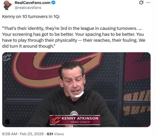 最后則是失誤問題,騎士隊首節之所以早早陷入20分以上巨大落后,核心原因是處理球的不謹慎,開局明顯沒有對上雷霆隊的比賽強度,單節出現多達10次失誤,全場讓對手雷霆利用失誤拿下31分,自己在該項僅拿到12分。