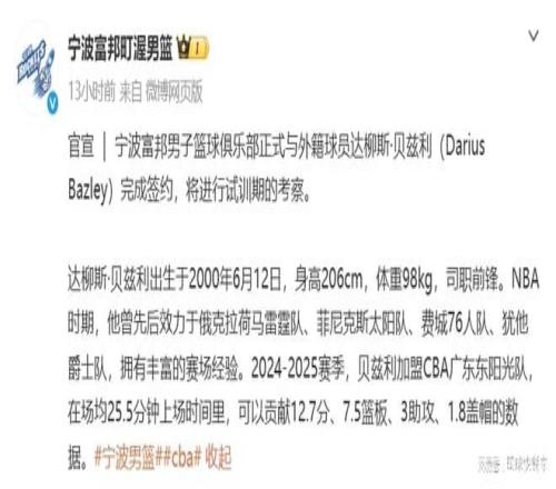 很顯然,在看到了沖擊季后賽希望以后,寧波隊也開始發力了。盡管他們在陣容配置上已經非常不錯了,可為了爭取更好的成績,寧波隊最終還是選擇更換外援。他們目前已經簽下了前廣東隊外援貝茲利。后者上賽季也在CBA聯賽效力,是廣東隊的頂級鋒線球員之一。盡管在上賽季,廣東隊的戰績不大理想,不過,作為替補外援,貝茲利還是給人留下深刻影響。