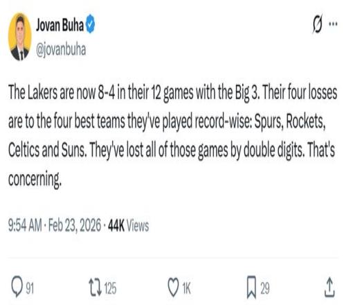 湖人媒體PurpGolded更是發文失望表示:“湖人這樣的表現很難突破首輪。”