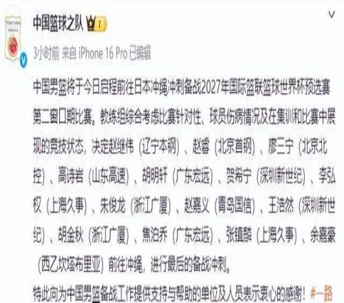 中國男籃將于今日啟程前往日本沖繩,全力備戰世預賽第二窗口期的比賽。經過教練組的綜合考慮,以及球員傷病情況和比賽中展現出的競技狀態,中國男籃最終決定派出14名球員征戰本屆世預賽,具體大名單如下:趙繼偉(遼寧本鋼)、趙睿(北京首鋼)、廖三寧(北京北控)、高詩巖(山東高速)、胡明軒(廣東宏遠)、賀希寧(深圳新世紀)、李弘權(上海久事)、朱俊龍(浙江廣廈)、趙嘉義(青島國信)、王浩然(深圳新世紀)、胡金秋(浙江廣廈)、焦泊喬(廣東宏遠)、張鎮麟(上海久事)、余嘉豪(西乙坎塔布里亞)。由于一場比賽只能上報12名球員,郭士強帶了14名球員就是為了防止傷病的發生,在對陣日本男籃賽前,中國男籃將會官宣最終12人大名單。