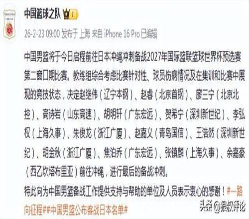 北京時間2月23日,根據中國籃協官方的公示,中國男籃將于今日啟程前往日本沖繩沖刺備戰2027年國際籃聯籃球世界杯預選賽第二窗口期比賽。教練組綜合考慮比賽針對性、球員傷病情況及在集訓和比賽中展現的競技狀態。