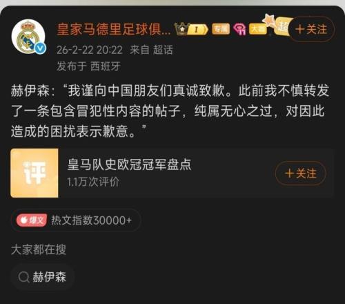 赫伊森辱華!皇馬微博發(fā)布特供道歉,國際社媒、赫伊森賬號沒表示