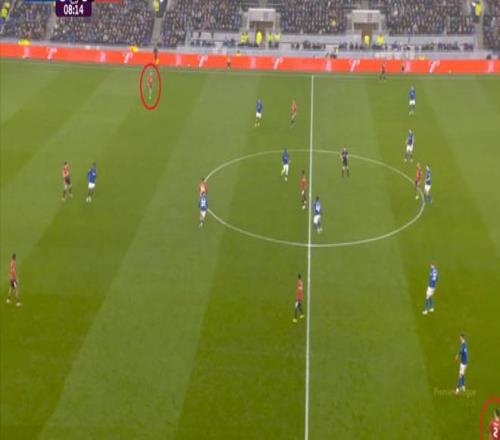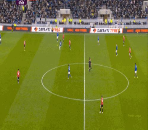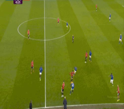 至于曼聯,由于各種各樣的問題和原因,表現也不是多好,但在部分回合,還是存在一些微小的優勢,就像第36分鐘,達洛特從肋部上去找到姆貝烏莫的時候,后者還是能甩開埃弗頓的雙中衛,為自己拉出處理球的空間: