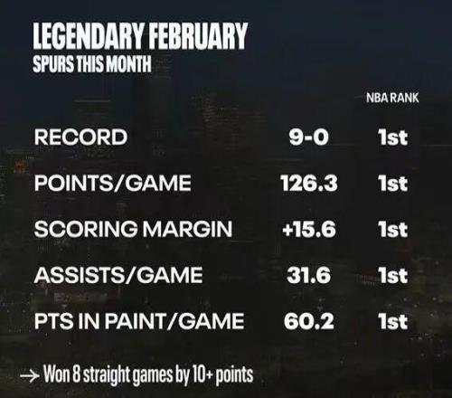 馬刺當前勢頭極佳,今年二月份至今未嘗敗績,9勝0負,并且場均得分(126.3)、場均凈勝分(15.6)、場均助攻數(31.6)、場均禁區得分(60.2)均高居聯盟榜首,對于他們而言一切皆有可能。