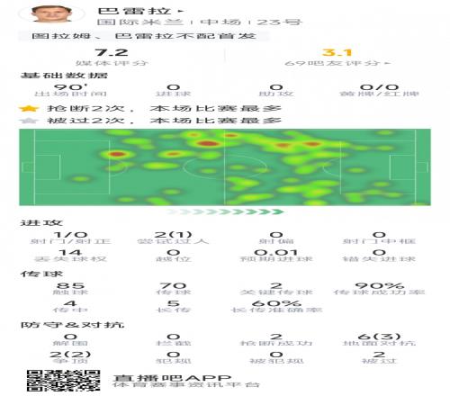 體育播報2月25日宣 在歐冠淘汰賽附加賽次回合,國米1-2不敵博德閃耀,本場比賽巴雷拉首發出場,以下為他在本場數據: