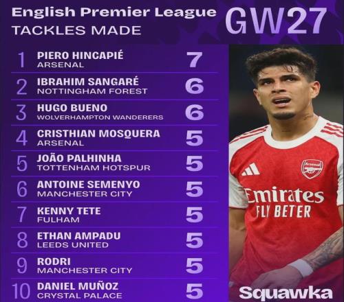 Squawka統(tǒng)計,因卡皮耶在對熱刺的比賽中完成了7次鏟斷,是本賽季阿森納球員在單場英超比賽中鏟斷次數并列最多的(廷貝爾對曼城)。