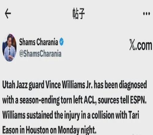 爆料王Shams:爵士后衛(wèi)小文斯-威廉姆斯確診左膝前十字韌帶(ACL)撕裂,賽季報銷。