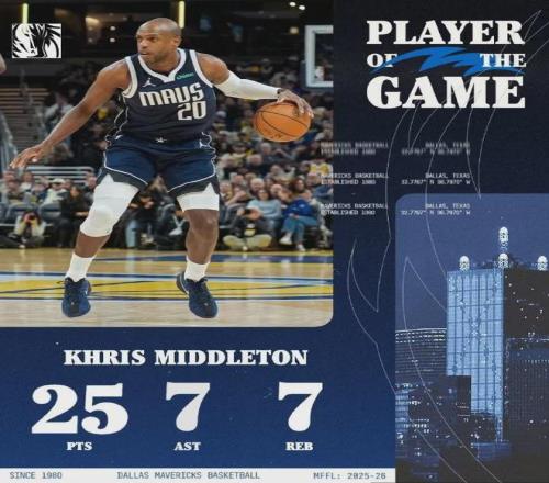 目前為止,米德爾頓已為獨行俠出戰五場比賽首發3次,場均上陣23分鐘貢獻14分4.8板2.6助,三項命中率49%、35.3%和88.9%。