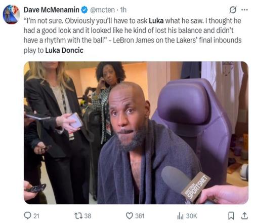 詹姆斯賽后也表示,東契奇應該投那是一個空位,傳給我時有點失去平衡了。
