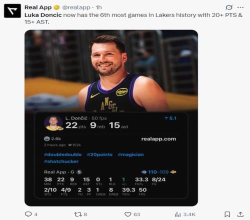 此役東契奇38分鐘,24中8,三分10中2,罰球9中4,拿到22分15助攻9籃板1蓋帽,命中率33.3%,三分命中率20%,真實命中率39.3%,此役他拿到20+15助攻升至湖人隊史第六。