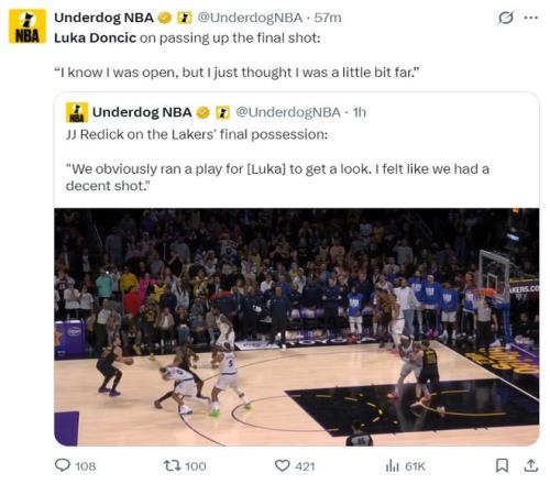 賽后雷迪克說湖人最后一攻就是為東契奇布置的戰術,但東契奇為自己辯解:我知道那是一個空位,但是我覺得距離有點遠。(東契奇的辯護顯得蒼白無力)